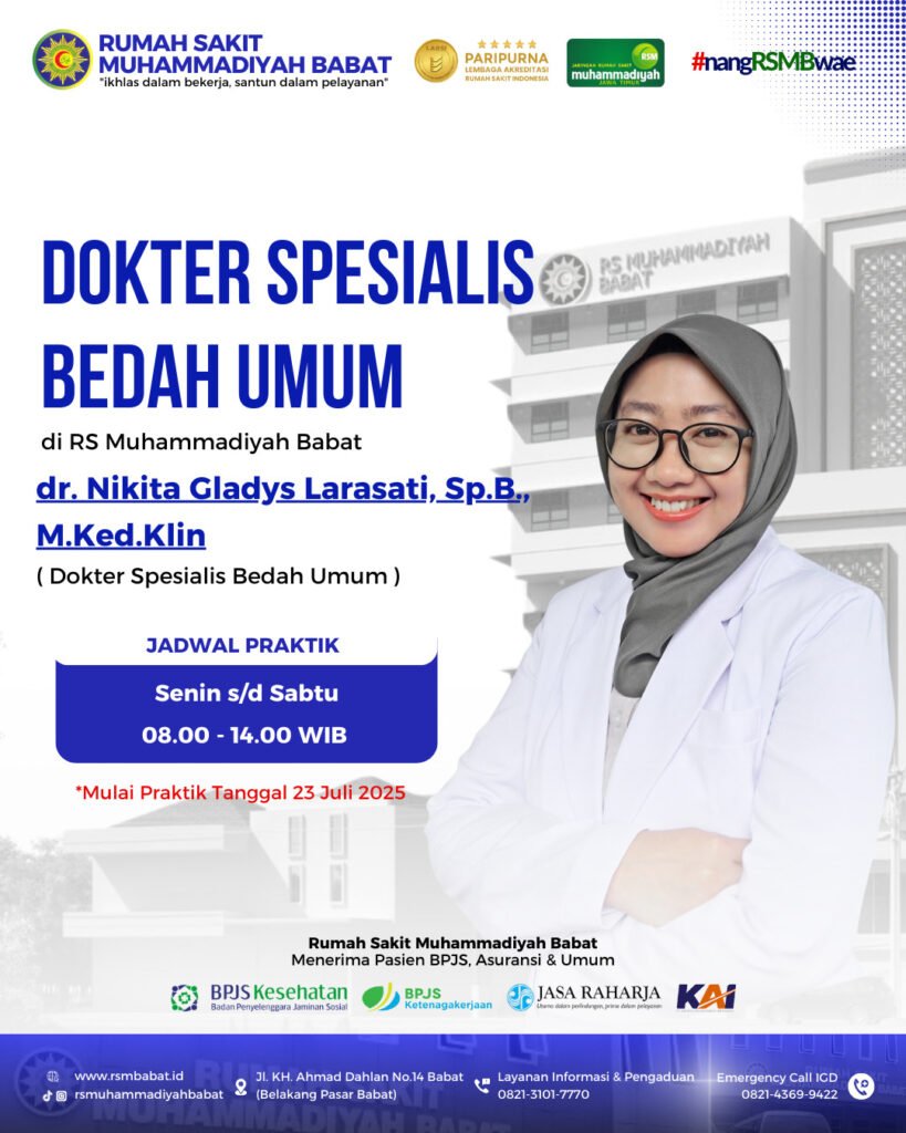Masyarakat kini dapat langsung berkonsultasi dan mendapatkan pelayanan dari dr. Nikita, Sp.B, M.Ked.Klin di RS Muhammadiyah Babat, Jl Gotong Royong No. 14 Babat-Lamongan (belakang Pasar Babat) dengan jadwal praktik setiap hari Senin sampai Sabtu pukul 08.00-14.00 WIB.