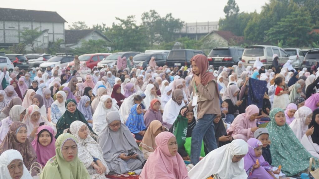 Tepat pukul 06.10 WIB, saf-saf jamaah telah terisi penuh hingga meluber ke area sekitar lapangan.
